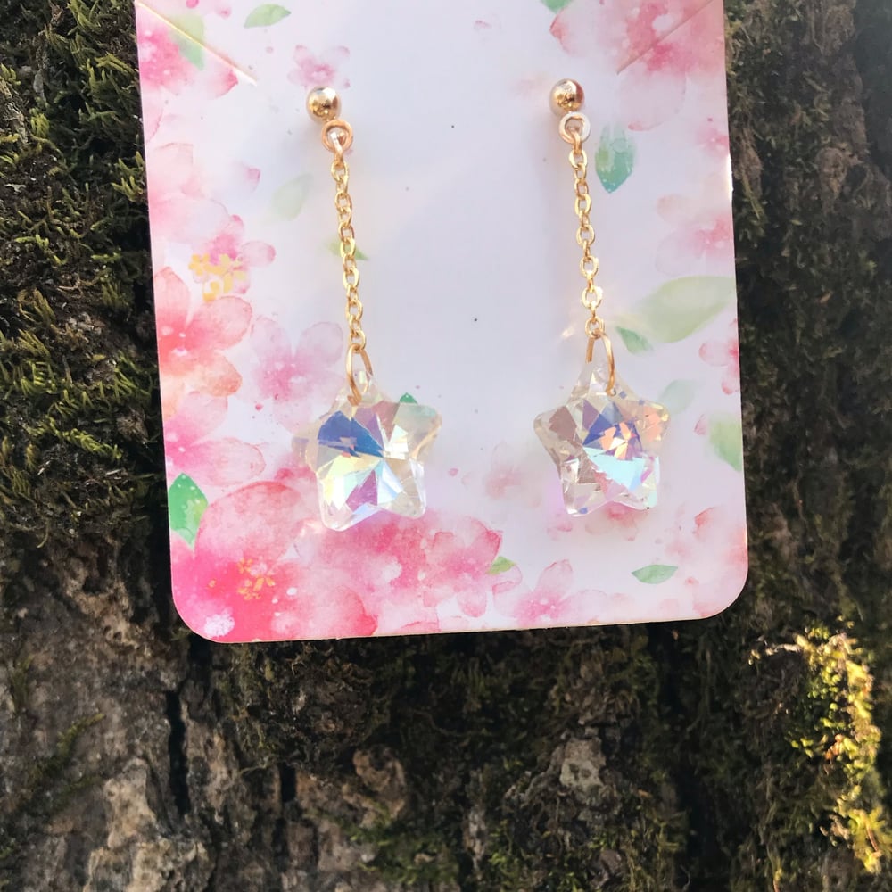 Dainty, light catching, crystal star earrings. Fits both everyday and formal occasions. Gold color gives an elevated, classy look with a whimsical touch. These earrings are hypoallergenic with rubber backings.